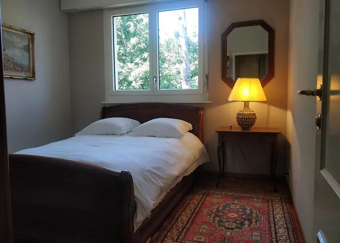 ChampelThe spacious 86 m^2 Apparemment Geneve Apartment overlooks the garden and is situated merely a 6-minute walk from Eglise Sainte Therese. Staying at the 2-bedroom apartment guests can check out the…View details+from